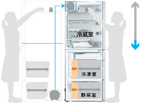 研究所のコンプレッサーを最上部奥に持っていく案に対し、平均的な身長の女性が手の届きにくい場所にコンプレッサーを移動し、手の届く引き出しの容量を大きくすることは大きな価値になることを視覚化。商品化に結びつけた。大きくなった引き出しを使いやすくするフルスライドレールや、ドアポケットの出し入れがしやすいローウェスト冷蔵室も提案。3つの UD ポイントは、20 年経った今もパナソニック冷蔵庫の価値として訴求されている。