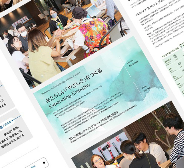 多様な人と共創するインクルーシブデザインを全社で推進するために、グループ横断プロジェクトを立ち上げ。視点を広げるため、社内外の多様なユーザーとのワークやツールの開発を行った。ミッション、ビジョン、行動指針を策定し、全社規定に落とし込んだ。