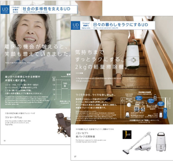 2020年オリンピックに向けてUD の価値を広く社会に伝えていくために6つの社会課題の解決をテーマにリニューアル。アクセシビリティを向上させるため、パンフレットには点字と、UD サイトの QR コードが触って分かる四角い枠を付けた。海外でも伝わりやすい表現を北米のアクセシビリティ担当社員に確認して作成。